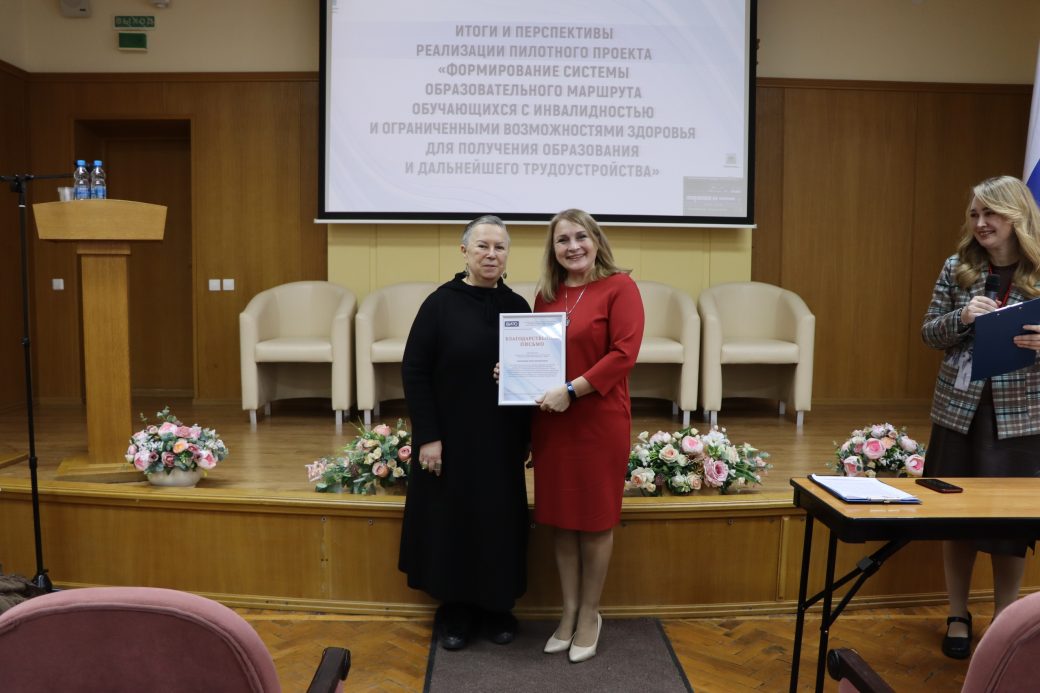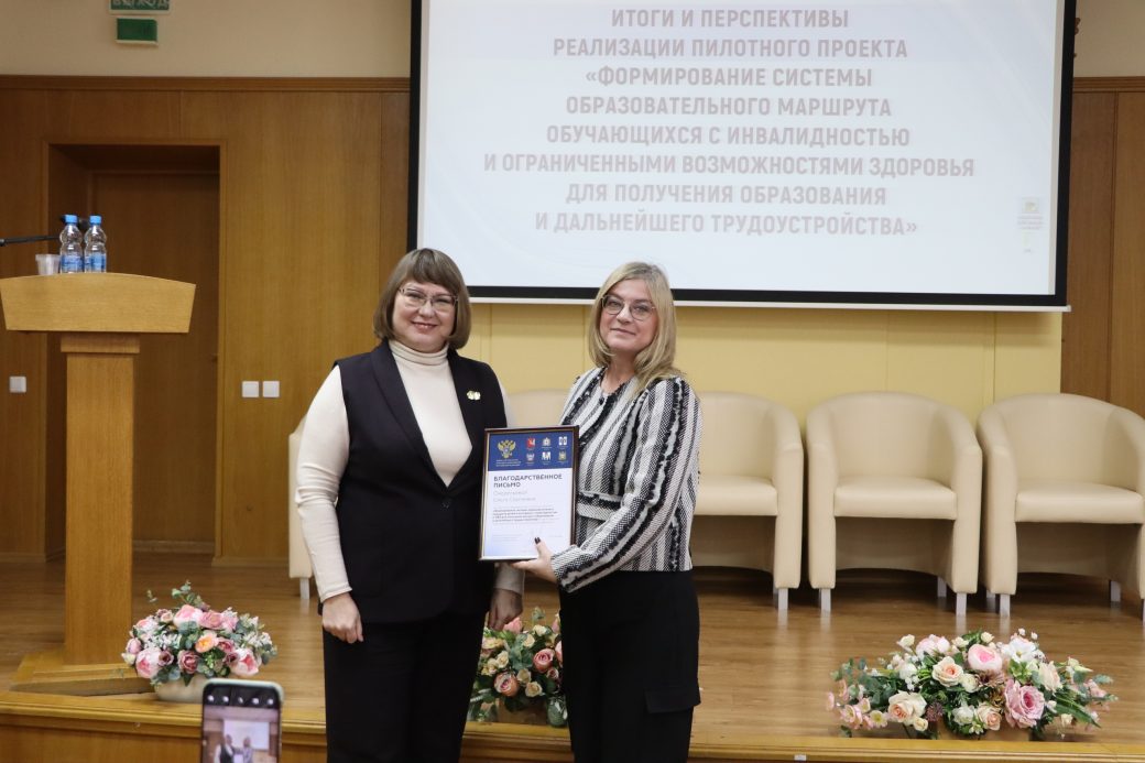 Первый заместитель министра Министерства образования Вологодской области Лариса Валериевна Святышева представила доклад «Итоги реализации федерального пилотного проекта «Формирование системы образовательного маршрута обучающихся с инвалидностью и ограниченными возможностями здоровья для получения образования и дальнейшего трудоустройства» в 2024-2025 годах в Вологодской области». По завершении выступления Лариса Валериевна вручила коллегам благодарственные письма Министерства науки и высшего образования РФ.