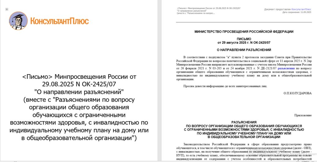 Разъяснения Минпросвещения по вопросу организации общего образования обучающихся с ОВЗ, с инвалидностью по индивидуальному учебному плану на дому в письме от 29.08.2025 NОК-2425/07